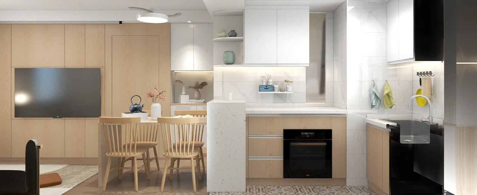 客厅中原木风较为明显,开放式厨房更为方便,可以更好的防止卫生死角的产生。