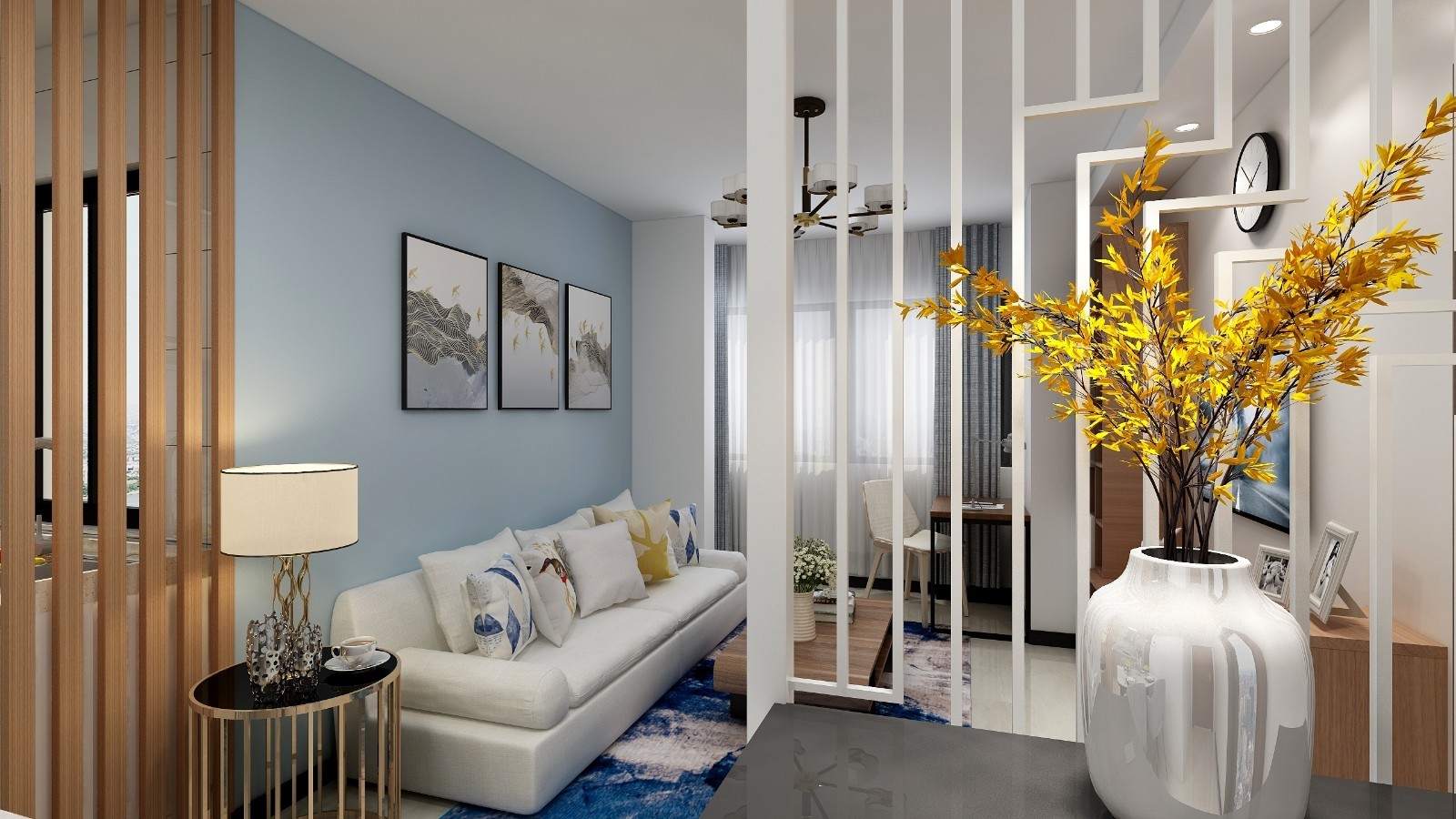 中规中矩的客厅设计,墙面挑选业主自己中意的颜色,玄关做白色隔断,玄关采用软隔断切割空间