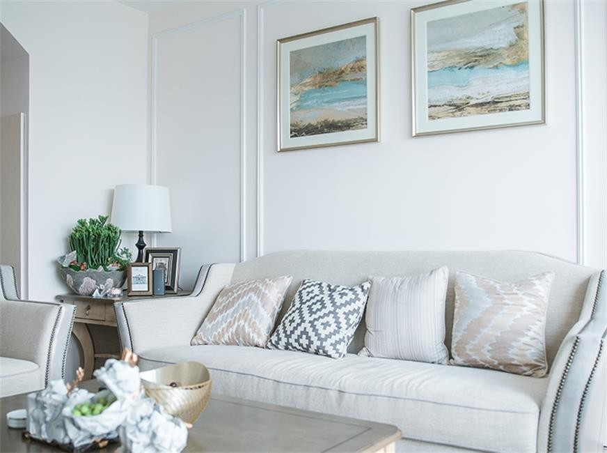 宽大的窗户提供了良好的采光,阳光透过沙白的窗帘,成了白天最自然的光源。白色的墙面两幅壁画点缀,给人视觉上的放松,让空间更有灵动性。布艺沙发的错落搭配,满足一家人的日常活动所需。浅色系的空间搭配原木色茶几,把空间变的独特又有魅力。