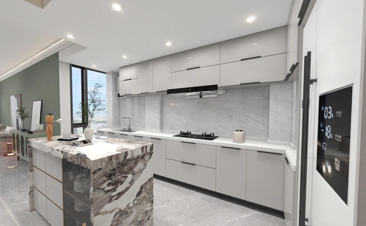 开放式厨房,并在厨房设计了一个吧台,厨房的色系为白色,简单耐看