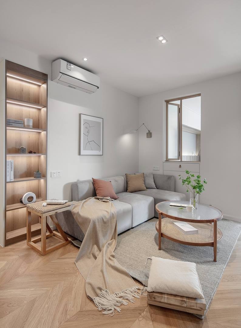 客厅利用拐角的柜子空间嵌入了一组书柜