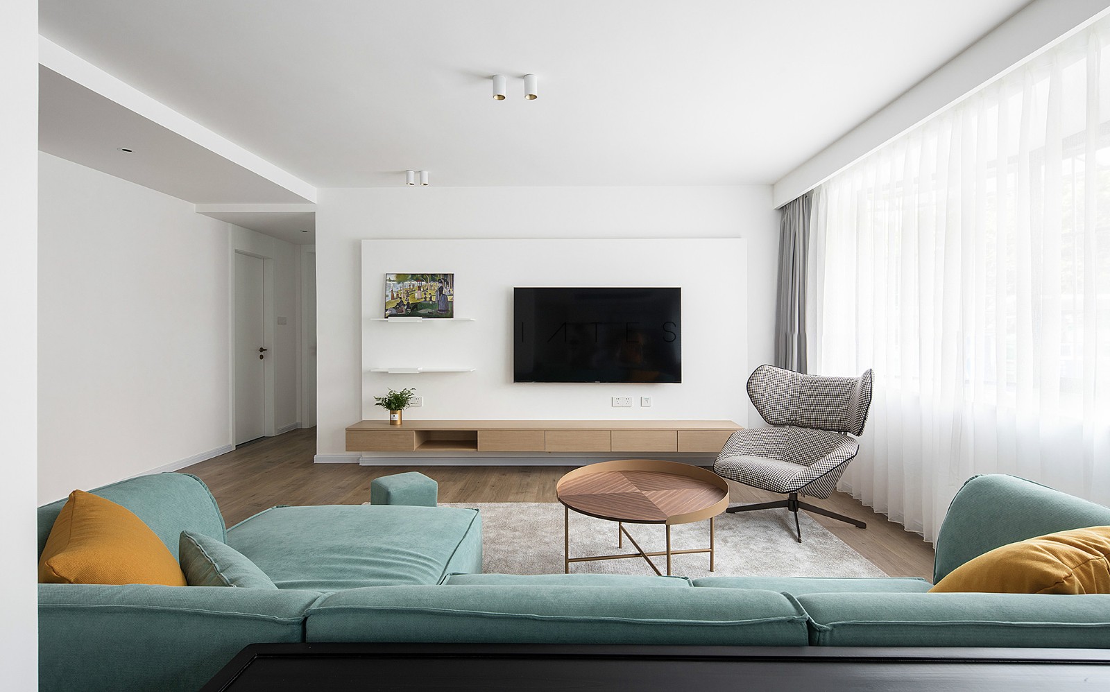 电视背景在原有墙面基础之上增加了另一层表皮设计,背后藏有氛围灯带,提供不同的视觉效果; 悬挑的木色电视柜在保证收纳的前提下,也方便打扫卫生,同时让空间更加透气;层板则作为点缀。