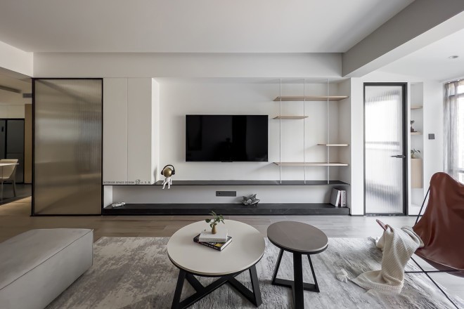 客厅大面积使用低饱和色调,为简约的现代家注入无限温柔。柔软的科技布艺沙发、皮质蝴蝶椅、岩板茶几,材质的融合碰撞,营造空间的秩序感和节奏感。