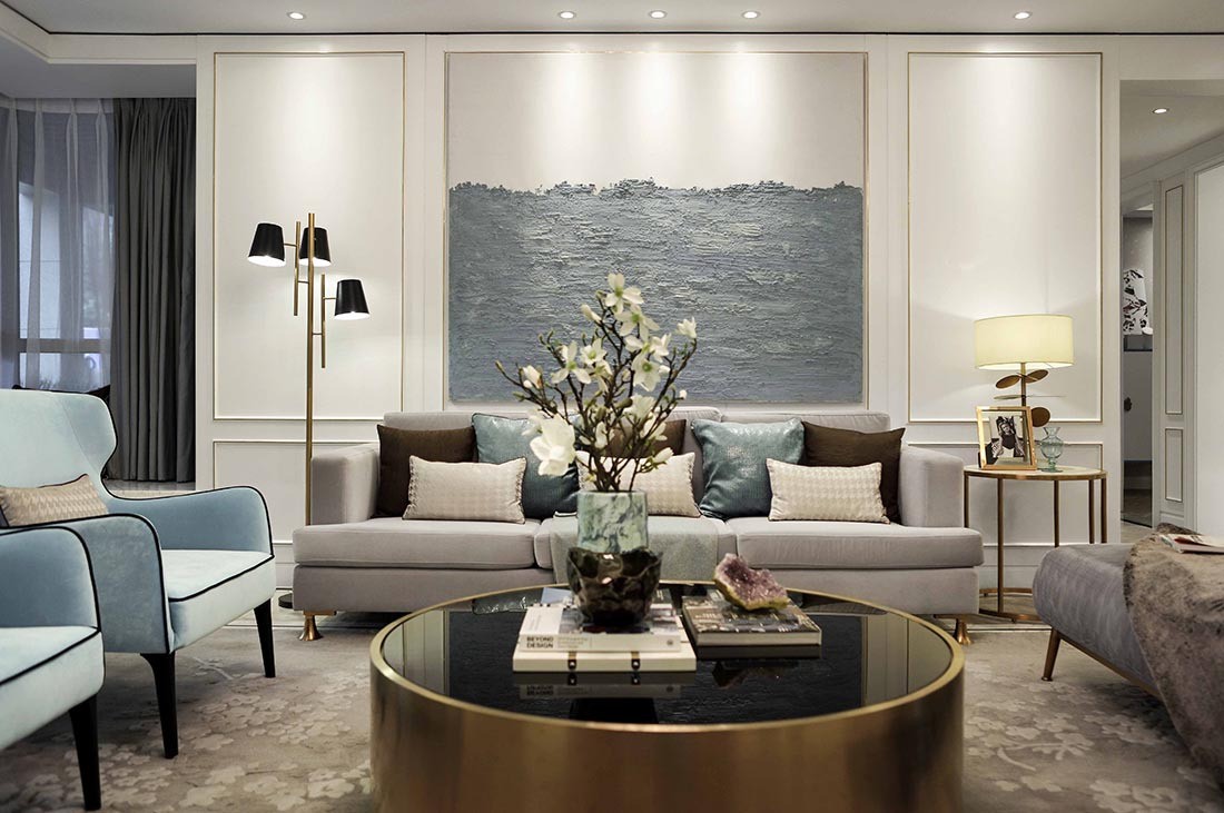 整个空间以淡蓝色为主题,有利于舒缓人的身心。客厅背景墙采用环保艺术漆涂刷出海浪翻涌的造型,独特中散发北欧风宁静清新的魅力。
