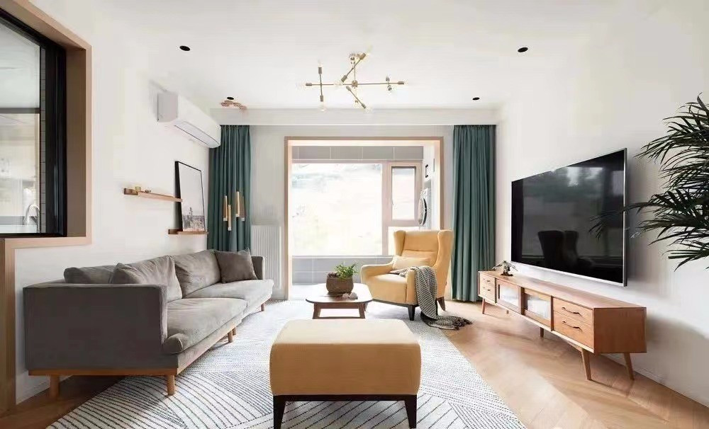 客厅位置取消了阳台位置的移门,阳光透过落地窗洒进室内,明亮通透,整个空间以灰白为主,简单朴素,墨绿色与明黄巧妙融入,打破了沉静的氛围,多处一丝灵动温馨的感觉。