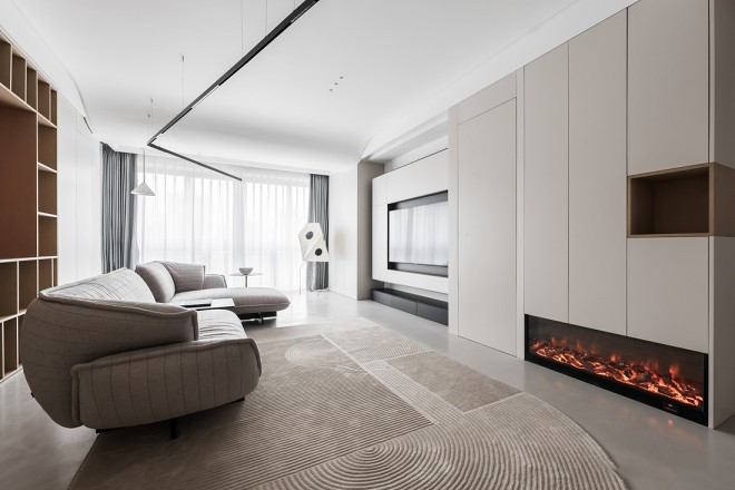 整面的柜体保证了空间长期维持极简干净的可能,和右边次卧的隐形门融为一体,形成视觉上的连续作用。悬浮的电视墙处理更显轻盈,右下角的电子壁炉带来一抹跳动的温暖。