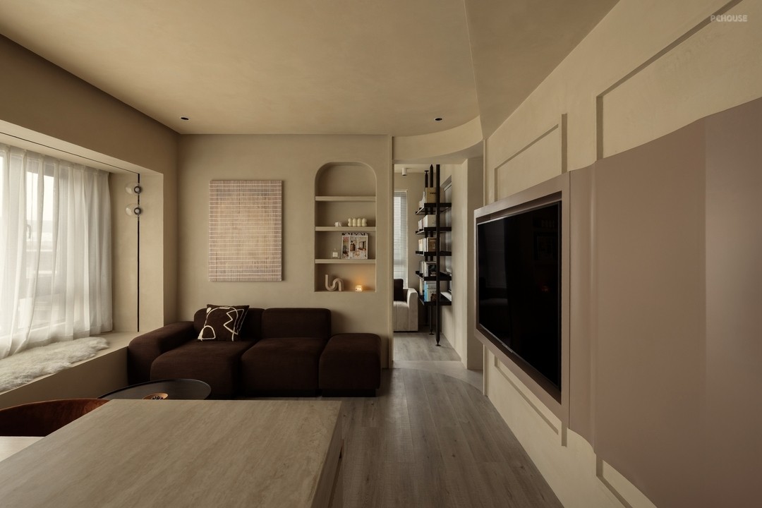 客厅主要以奶咖、白、木色为基调,整体空间采用低饱和度色调;微水泥设计,呈现出原生态的肌理感;极富艺术感的墙面,赋予了这个家灵魂和旋律,有一份独到的简朴雅致美。