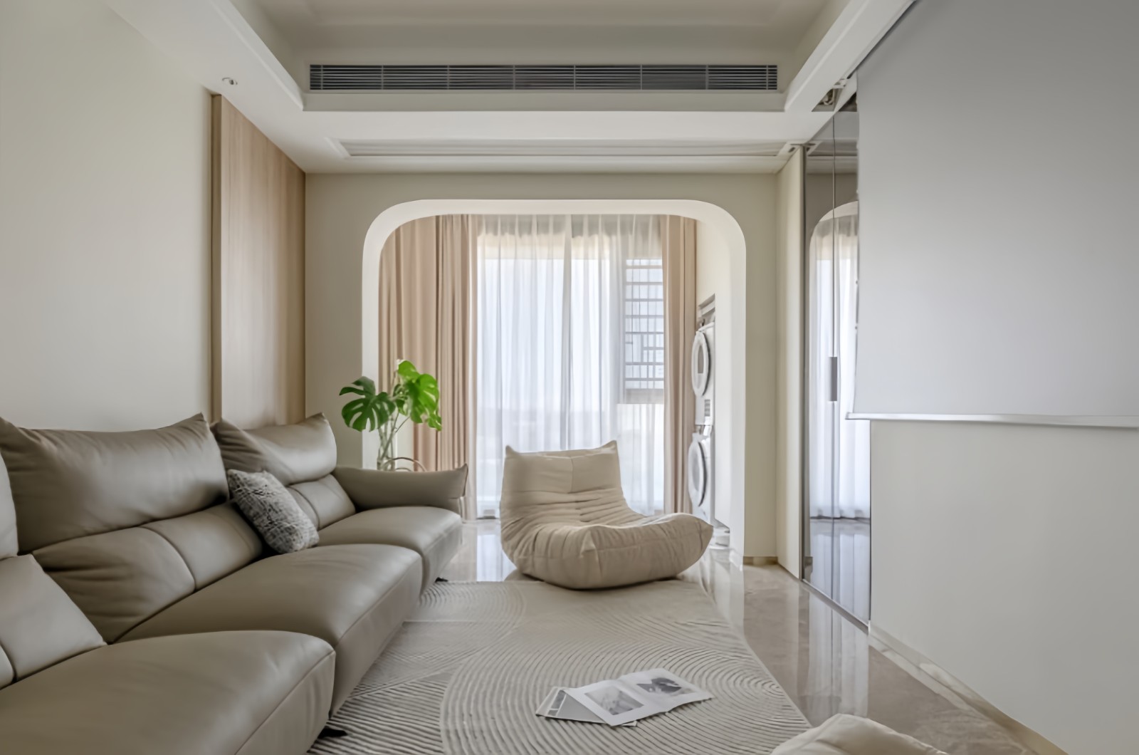 客厅整体以低饱和的家具为主,灰咖色的皮质沙发和灰调的条纹地毯搭配,看上去更加静谧舒适,懒人沙发提供了更为慵懒的休息方式。暗藏投影幕布,不用时收起来,让客厅看上去更整洁不繁琐。
