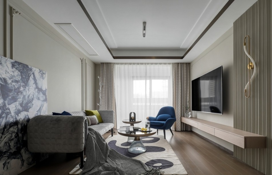 客厅以白色的线性射灯作为主光源,光量柔和充足,灯光向下打、不扩散;吊顶四周暗藏灯带,光线由内至外散发出来,明暗结合的搭配,整体营造出立体的氛围感。