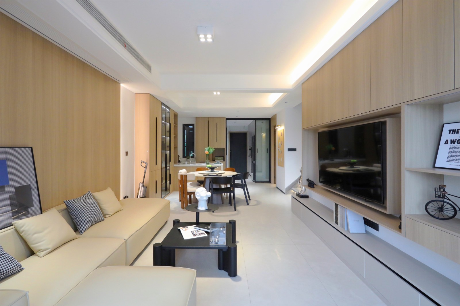 以木饰面护墙板与定制电视柜为客厅空间的点睛之笔,展现出一种简约而不简单的美感。