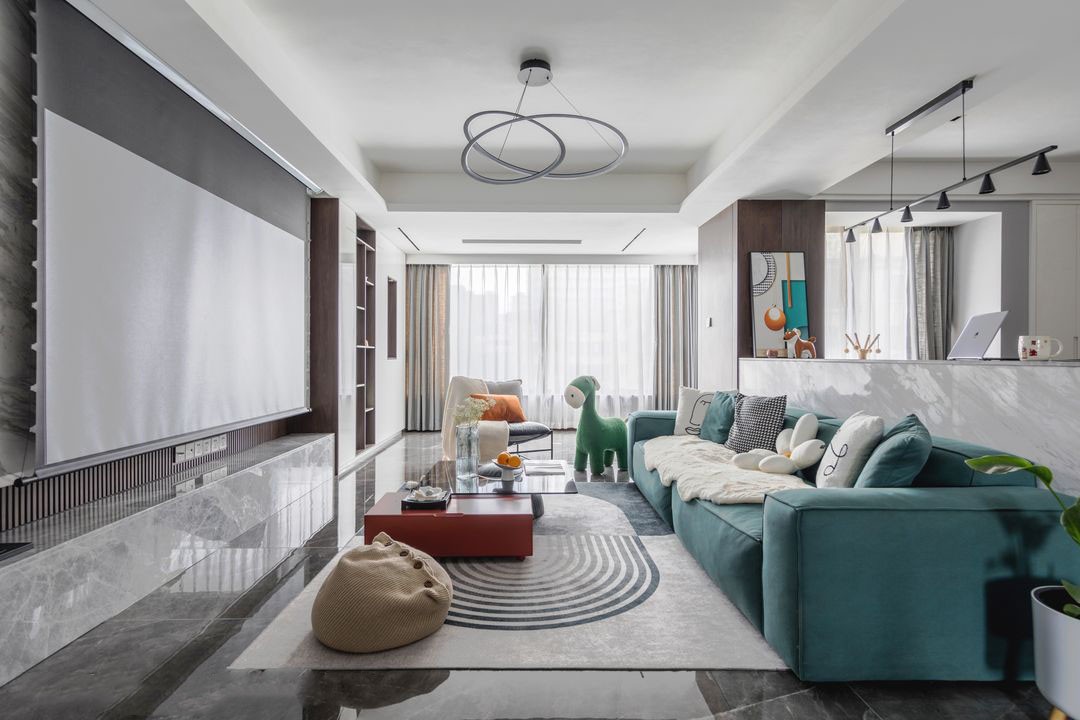 客厅上方环形吊灯,以及沙发背后的吧台上使用的直排铁艺吊灯,为空间增加了造型感,餐蓝色的沙发黑色与红色搭配的茶几,色彩搭配河西额,让人心情愉悦,客厅按照业主的喜好,用投影仪取代了电视,如果想看电影就可以将窗帘拉上效果堪比影院。