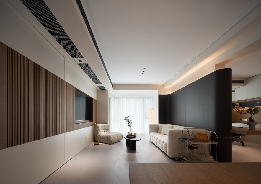 客厅沙发背后用深灰色的护墙板作为背景,深色的背景让沙发的材质更大限度的得到提升,护墙板不到顶的设计是为顶面照明提供了空间,两侧的圆弧收口衔接减轻了承重墙体的的厚重感