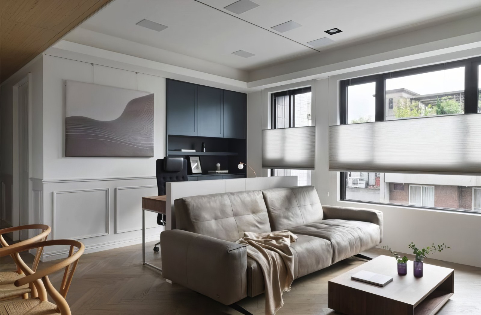 床头背景墙以石膏线条+格栅线条为装饰,大面积的留白在其点缀之下,让简约的空间多了一些温润和内敛。