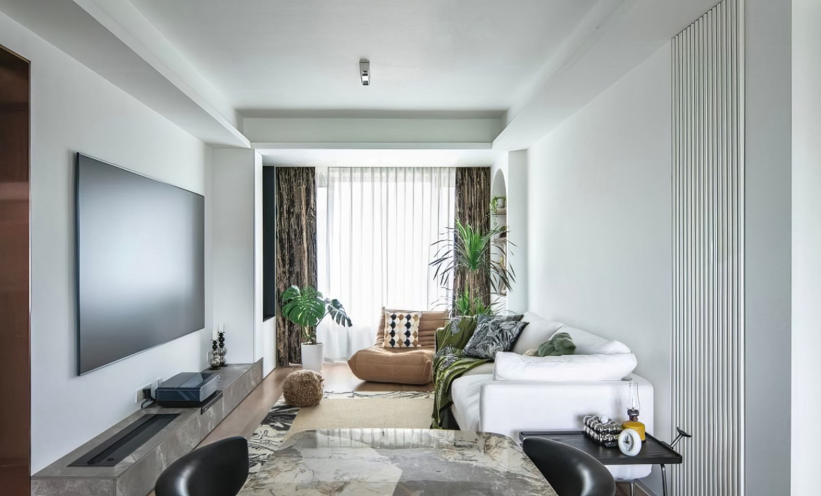 激光电视上墙,整面墙黑白配比得到平衡;原木地板通铺全屋,视觉更为统一,角落处的龟背竹也为家里增添了一丝生机。采用无主灯设计扩大空间感,轻松营造舒适温馨的惬意氛围。