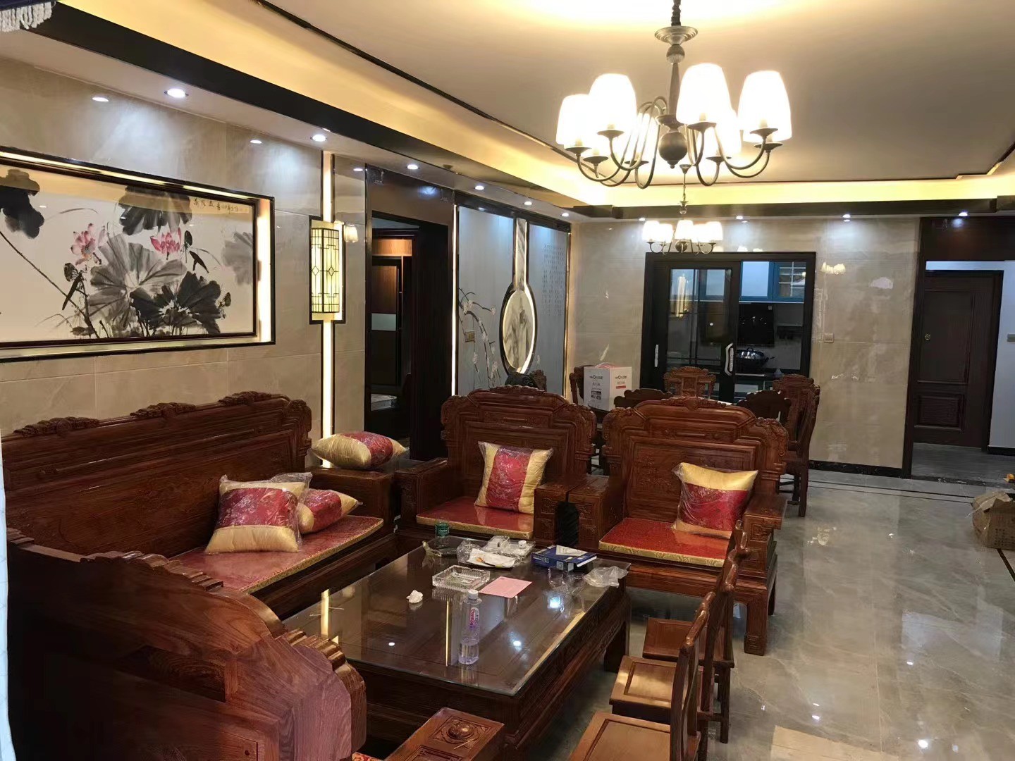 韶关马坝明珠城四房两厅两卫,毛坯新中式装饰,从进场装修到家具电器安装搞卫生都是我们跟踪服务。得到好评!感谢信任!