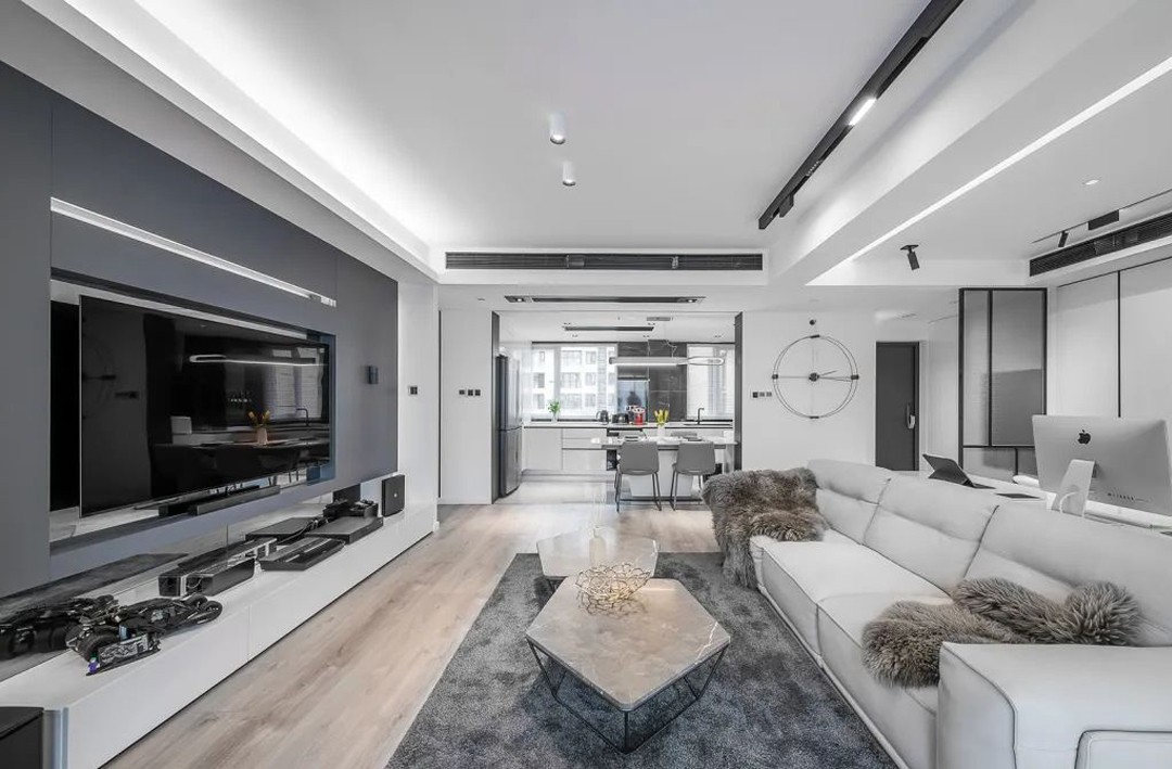 客厅原本是横厅户型,以开放式的餐厨空间,让沙发后的空间布置成办公游戏区,宽敞的开放空间,也让居家生活更加轻松自然。电视墙以深灰色与银镜背景,布置白色的电视柜,丰富多样的电器影音设备布置,让客厅氛围显得现代时尚而又年轻。
