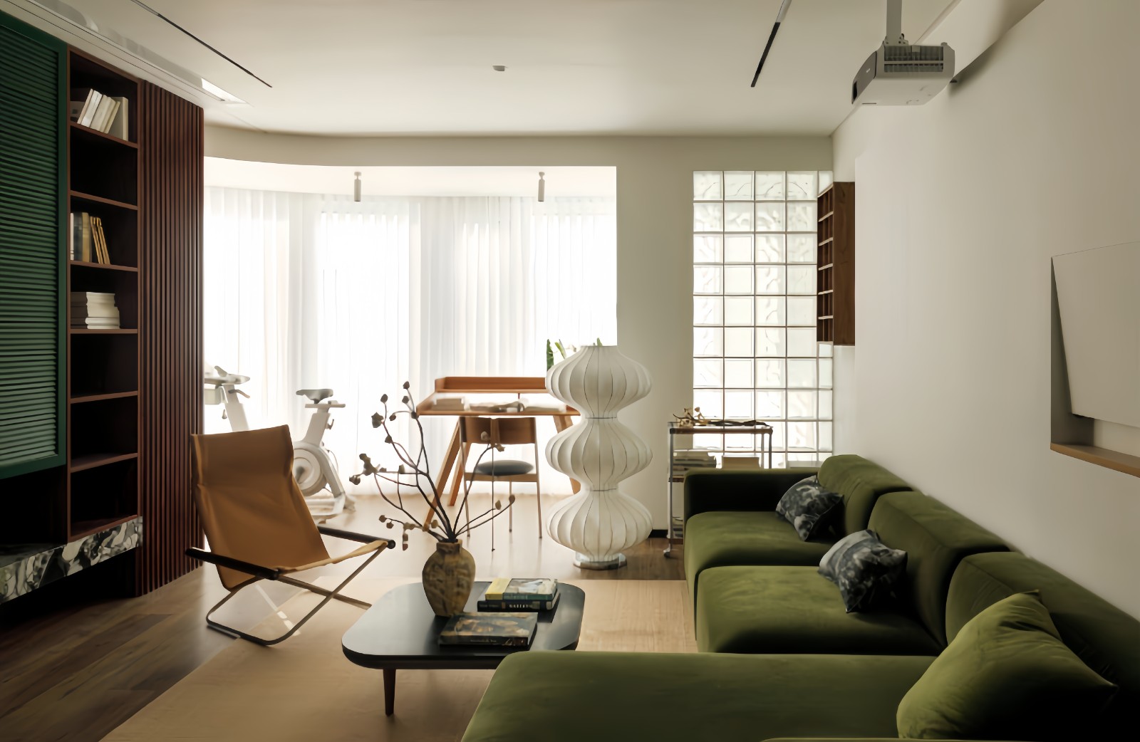 丝绒质感的牛油果绿沙发,沙发造型线条利落,却被填充得相当饱满, 沙发的斜对面,一把单椅成为空间点缀。质感的姜黄跳跃却不浮躁,椅形贴合人体曲线,坐起来超舒服,甚至舒服过沙发。放在这个阳光房里,只是坐着发呆,都极其放松。