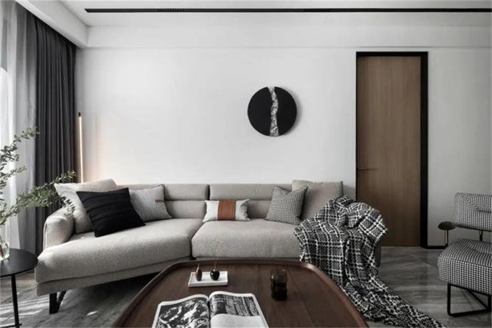 现代风的客厅,整体空间硬装有点黑白配的***设计感,布置上灰色地毯与沙发,则是让空间显得简约舒适而惬意。沙发墙以摆设乳胶漆的基础,中间挂上一幅圆形的艺术造型装饰画,右侧加入以上木质感的房门,带来一种低调自然的舒适氛围。