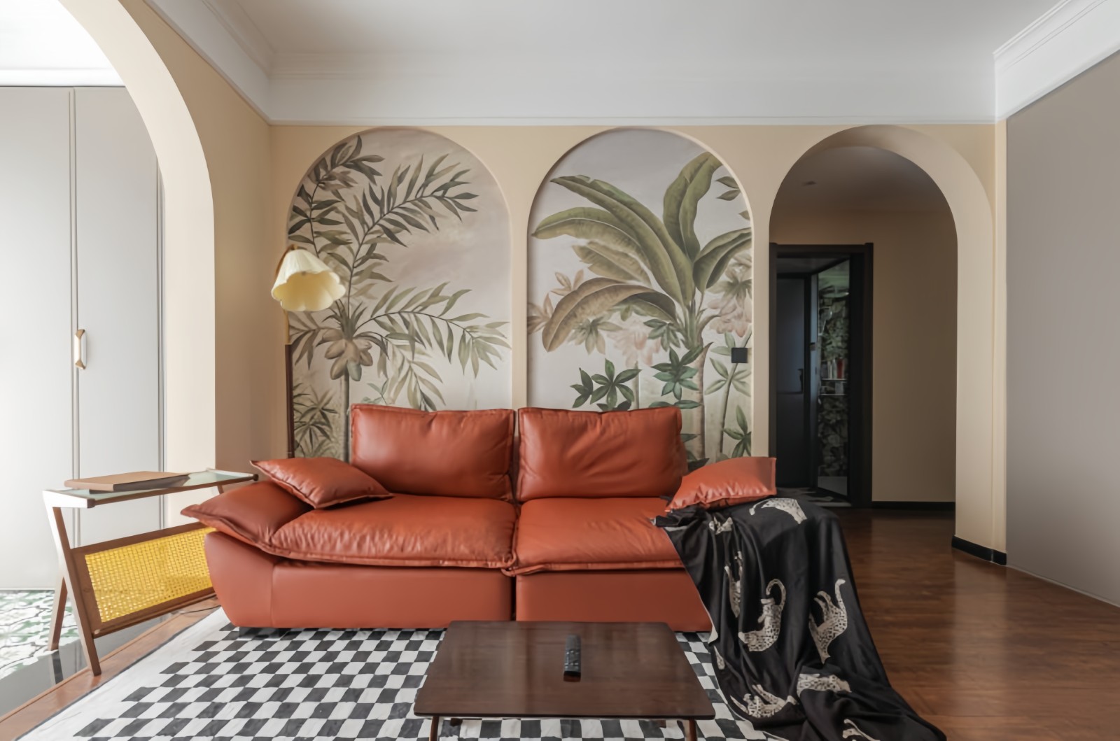 沙发背景采用拱形造型并延伸到过道拱形门洞,整体完全融为一体。三个拱形造型矩阵排列,体现庄严生动的仪式感。搭配山林绿竹的壁画设计,更添些许趣味性。