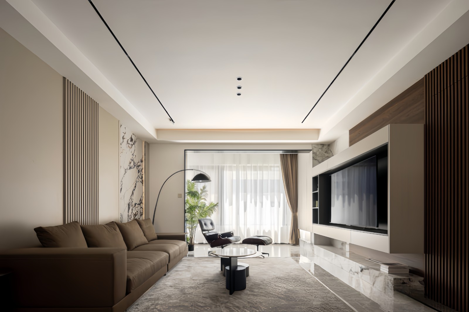 整个客厅空间以精致舒适的意式轻奢风为内核,电视背景墙采用拼接式设计,结合石材贴面电视柜与木格栅隐形门,尽显高雅格调。