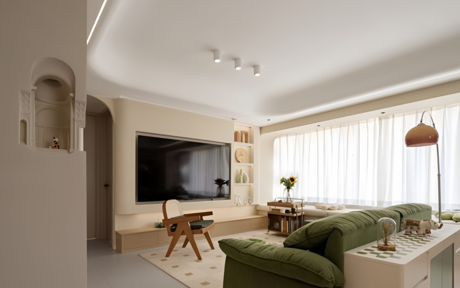 客厅沙发挨着飘窗,长长飘窗垫一铺,客人再多也有地方坐了。吊顶设计以保留原有层高为原则,配合圆弧造型削弱明显的高度层级差,柔化整个空间的造型。