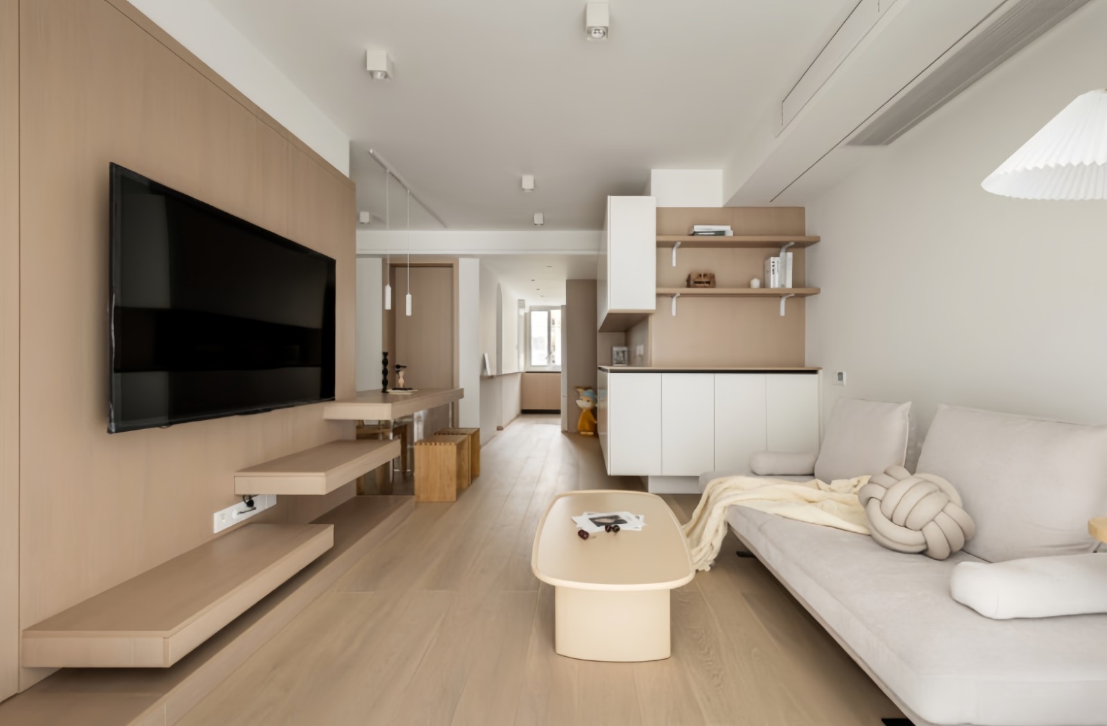 客厅部分中,电视背景墙被包裹了一层浅色木饰面板,分别错开打造了几块木色层板,便于置物又使得墙面拥有个性与层次感,搭配浅色系网红软装,使得整个空间治愈又时尚。