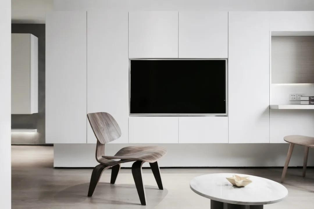 ▲电视墙的定制柜采取悬空定制安装的方式,电视机嵌入中间位置,带来一种极简大气的视觉设计感。