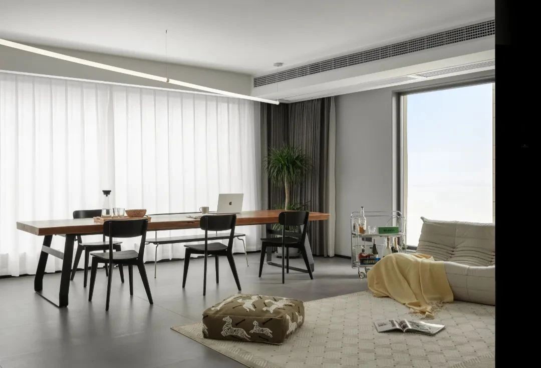 客厅与餐厅的一体化设计令整体空间更加畅通,同时深化了相互之间的互动交流。无需设置突兀的隔断,仅凭沙发与餐桌便能自然地分隔出不同区域。