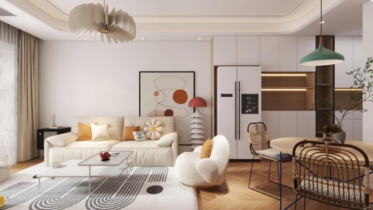 主体色调以奶白色为主,柔和的家具造型搭配原木家具,营造温馨氛围感,超大落地窗采光通透,整体空间非常柔和。花瓣吊灯为整体空间作为点睛之笔。