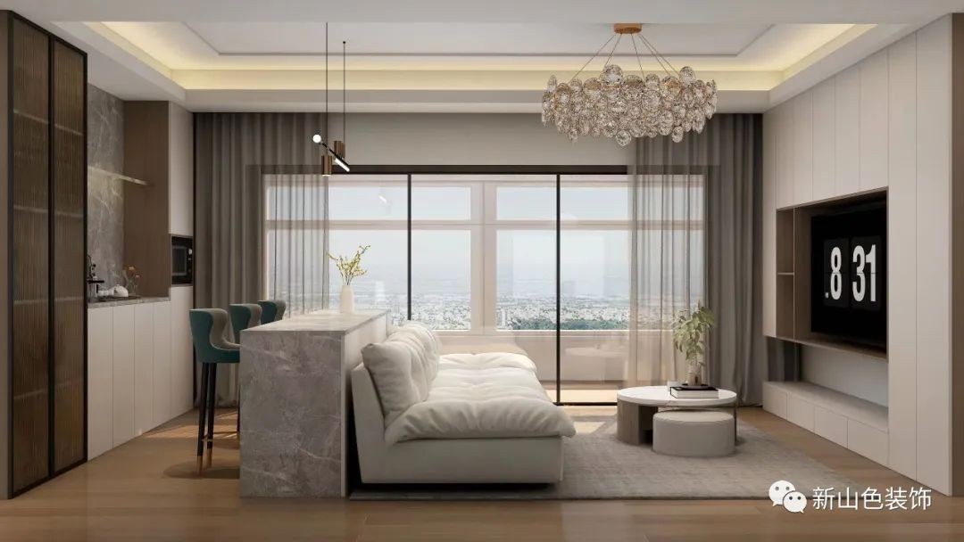 整个客厅以浅色贯穿进行色彩搭配,小株绿植点缀,木纹砖减弱了大空间的冷淡感,配合灯光更加温润的质感
