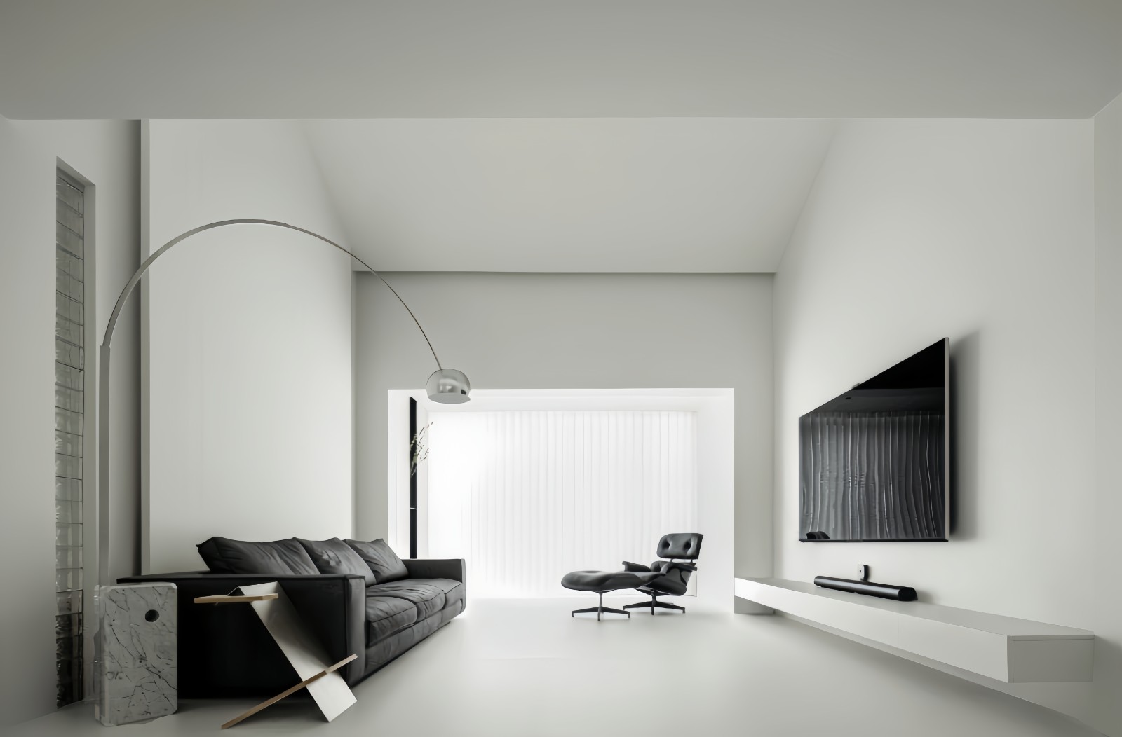 地面通铺纯色岩板,与大白墙形成完美的视觉一体感,无限放大空间,释放空间张力。