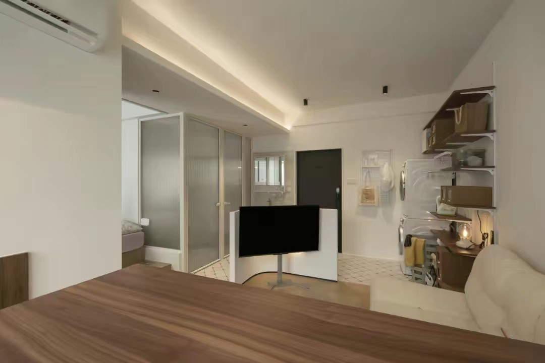 这面小小的弧形半墙功效显著,既实现了不同功能区的划分界定,又让支架电视有了依靠、不显突兀,整个空间的动线也顺势形成。