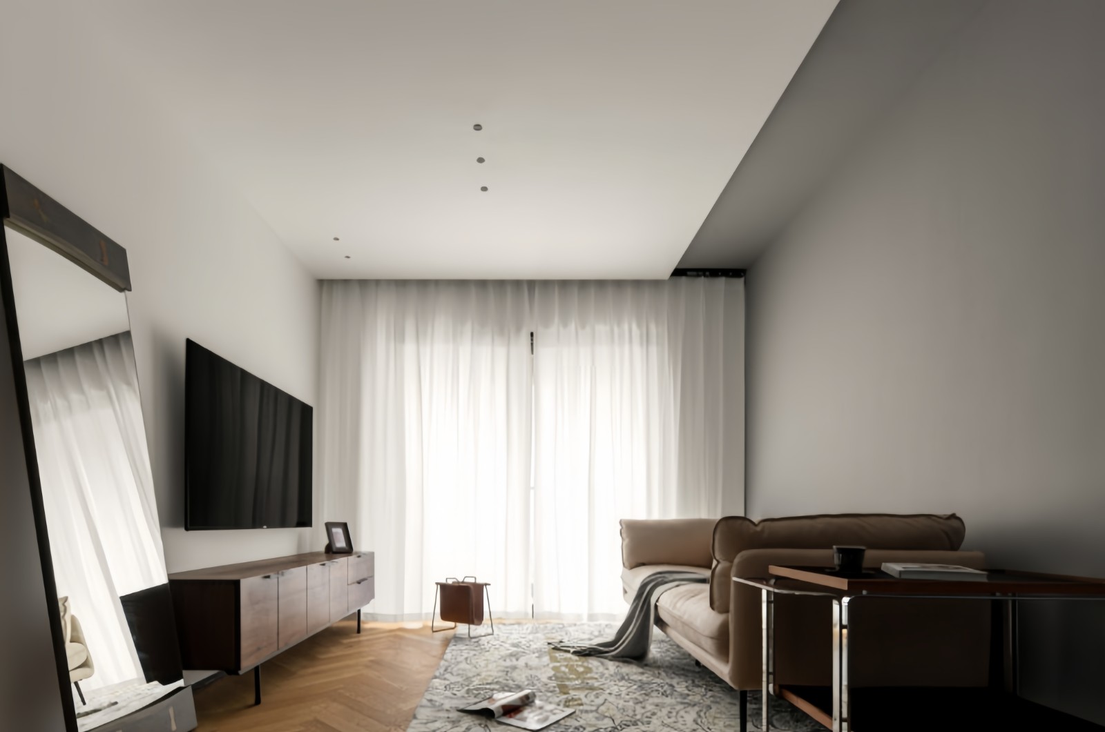 平时需要晒洗衣物,所以保留了原始户型的晾晒阳台。整个客厅依然保持极简的设计风格,平顶舒展铺陈,射灯点缀其间,整洁利落,视线开阔。