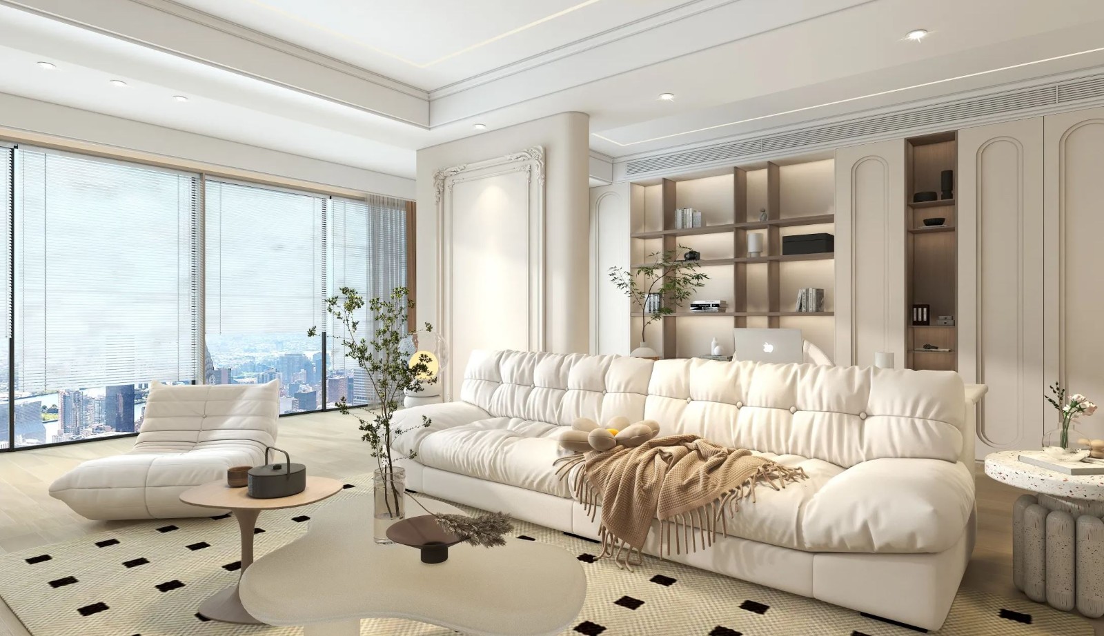 法式风浪漫雅致的情调与奶油风简约素雅的氛围,构成温馨浪漫的居家氛围。此案为奶油法式风格平层设计,套内面积约170㎡。