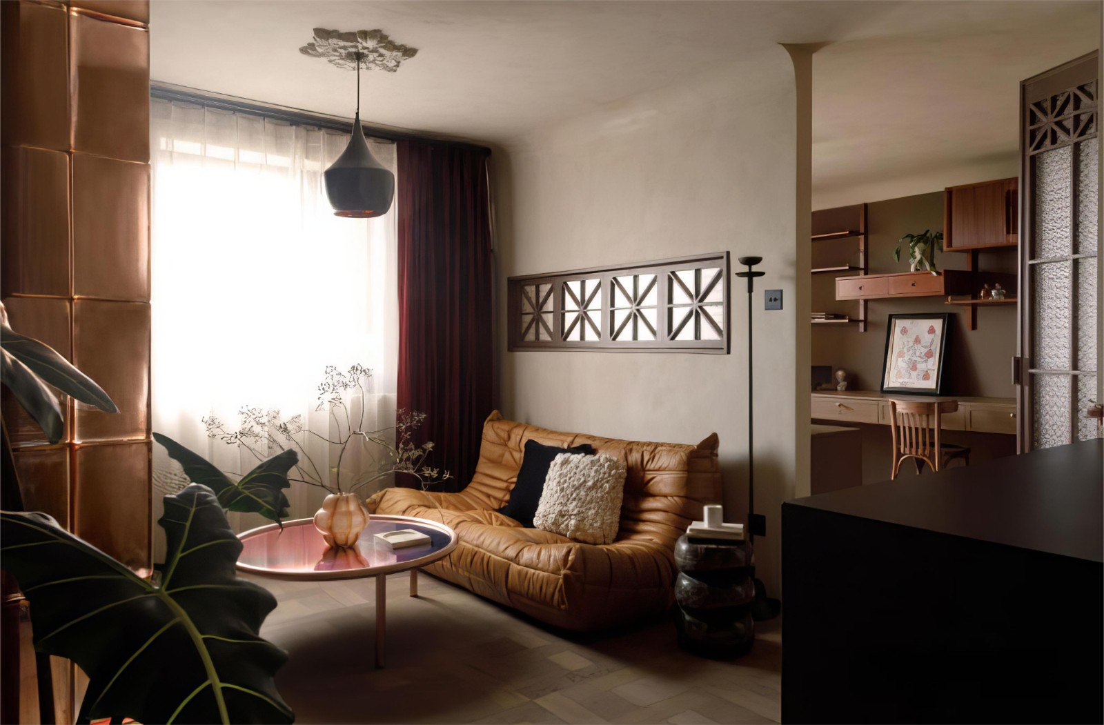 尽可能的保留空间层高, 没有做过多的吊顶, 但在墙角设计了小弧形增加趣味性.沙发是中古风皮质沙发, 中古家具自带年代感, 使用过的痕迹反而增添了它的味道。