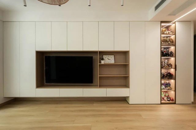 电视墙打满整面储物柜,为此底部特意做了悬空设计,以减少柜体的压迫感; 旁边的窄柜做了一列玻璃橱窗+内嵌灯带,用来展示女主人的手办,为家里打上鲜明的个人印记。