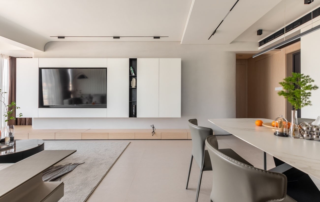 客厅电视机背景墙舍弃了传统的直角边改用了户型设计,弱化了空间的锋利感,白色电视机柜搭以原木色地柜搭配出干净素雅的温馨氛围。
