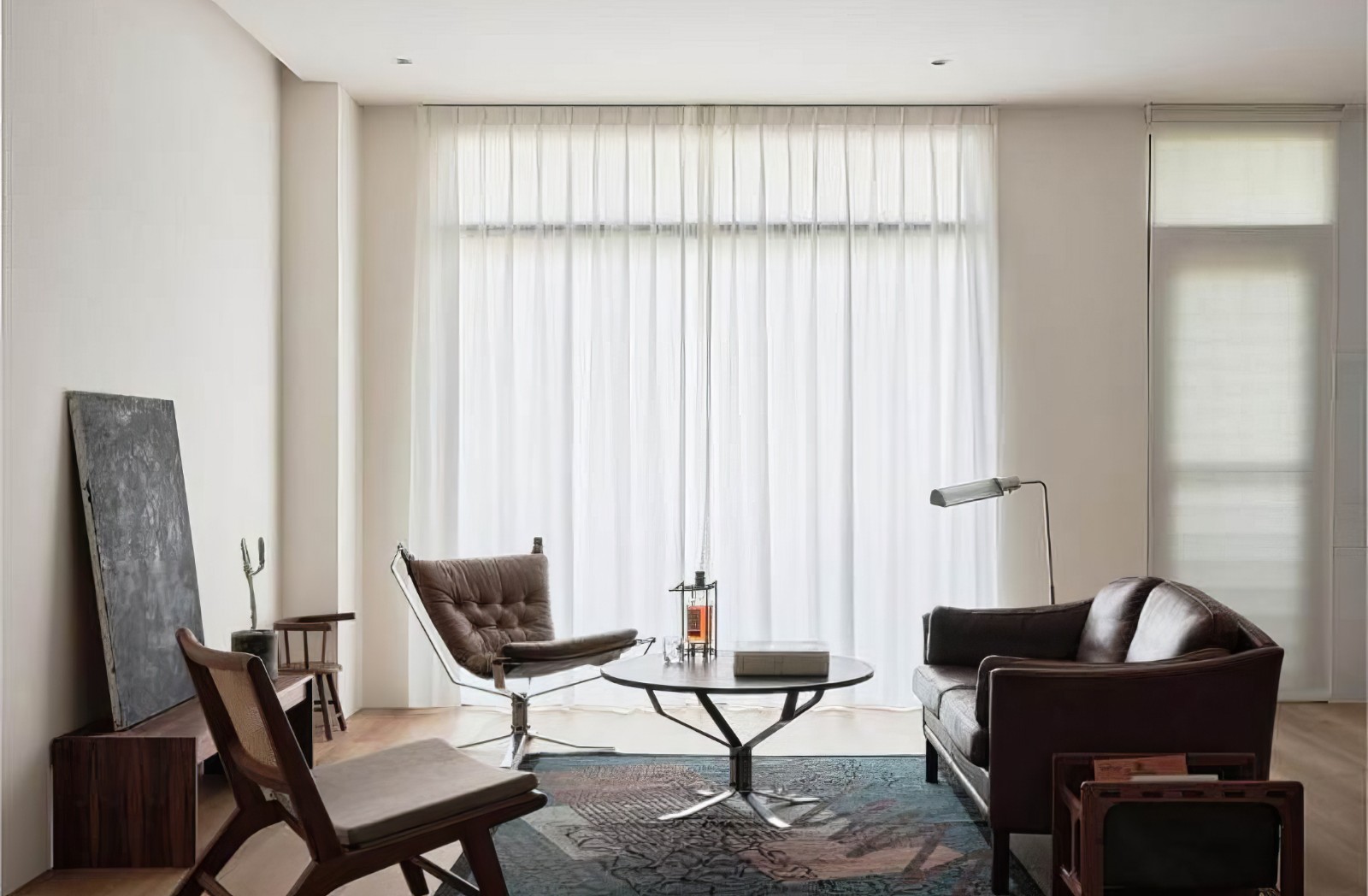 客厅软装选用皮质咖色沙发,搭配同色系沙发椅围绕圆形茶几摆放,轻松围合出简约舒适的洽谈空间。摒弃传统,去电视化+白墙处理设计,底部利用原木打造置物区,黑色创意画作为点缀,不仅增添了质感还成为了视觉中心点,无疑是客厅一大亮点。