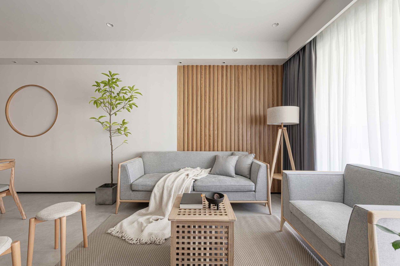 厅无主灯设计,利用点光源+落地灯设计,根据不同的使用场景切换相应的照明模式,让空间更有层次感。