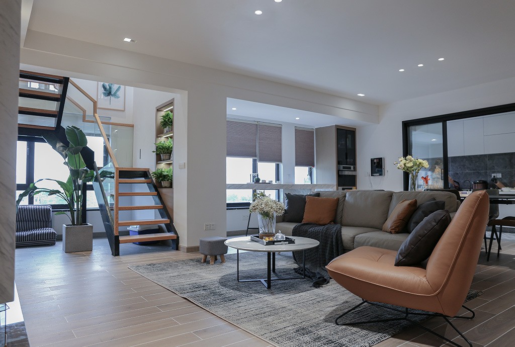 厨房切菜区域在吊柜底部设计了自动感应的灯带,过道有洗墙灯,楼梯有踢脚感应灯,过道设计了线性灯作为通道的装饰,柜子里面也设计了感应灯,整个无主灯的设计让整个空间更为简洁。