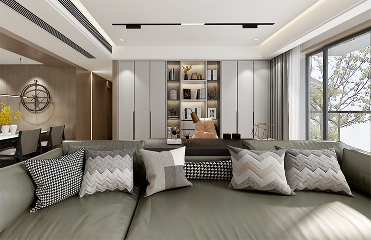 客厅删繁就简,游走在简约自然的理想境界。电视背景选用大理石+木饰面做结构造型,两材质结合,造型变换,加入灯带的设计,空间层次更丰富。同时利用磁吸轨道灯、线性灯的可变灯光设计,使整个顶更加干净,给人以见光不见灯的感觉。