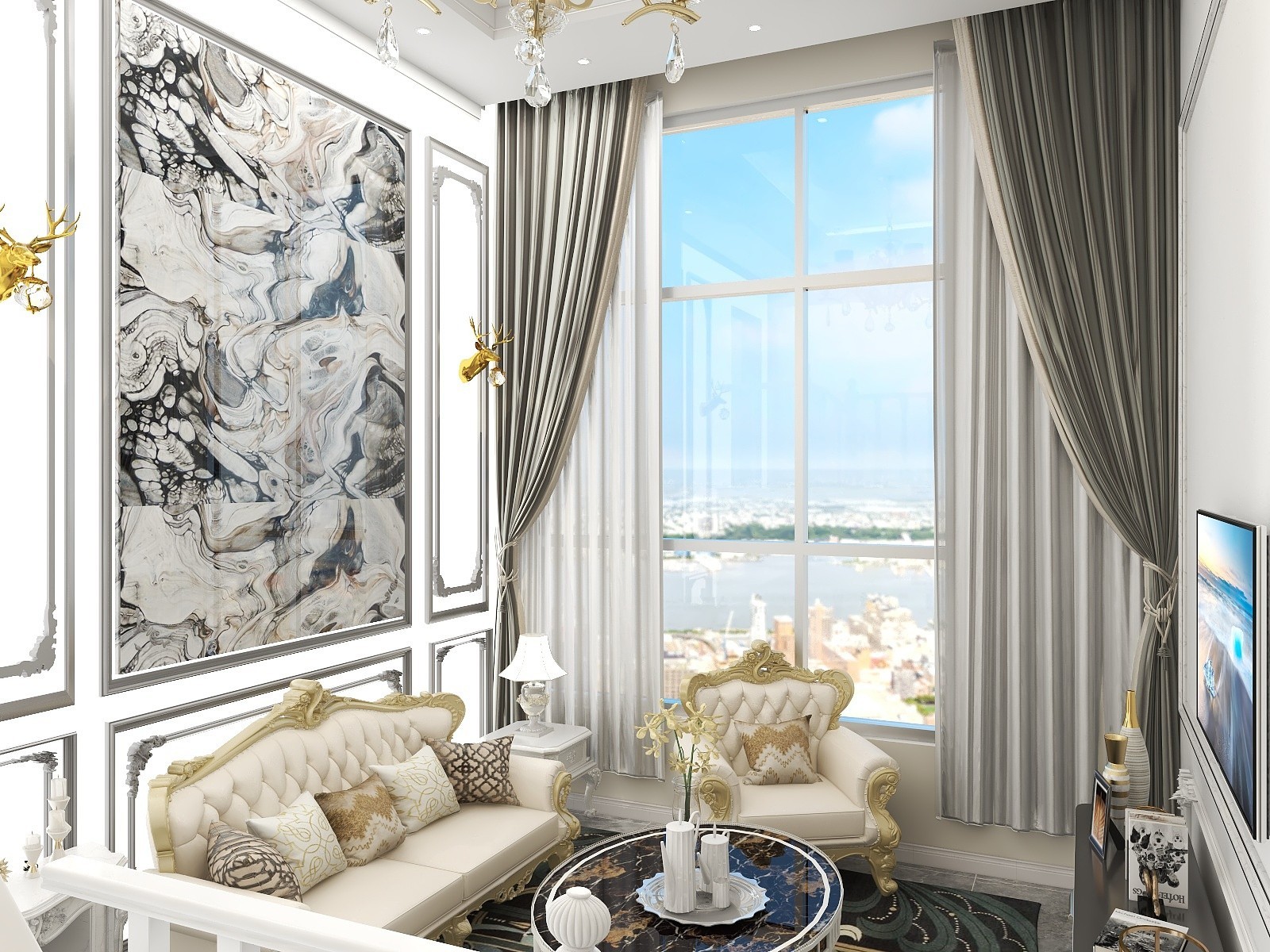 客厅房高为4.5米,此空间吊顶+中央空调,在加上将近落地窗,整体采光通透,风格大气奢华!