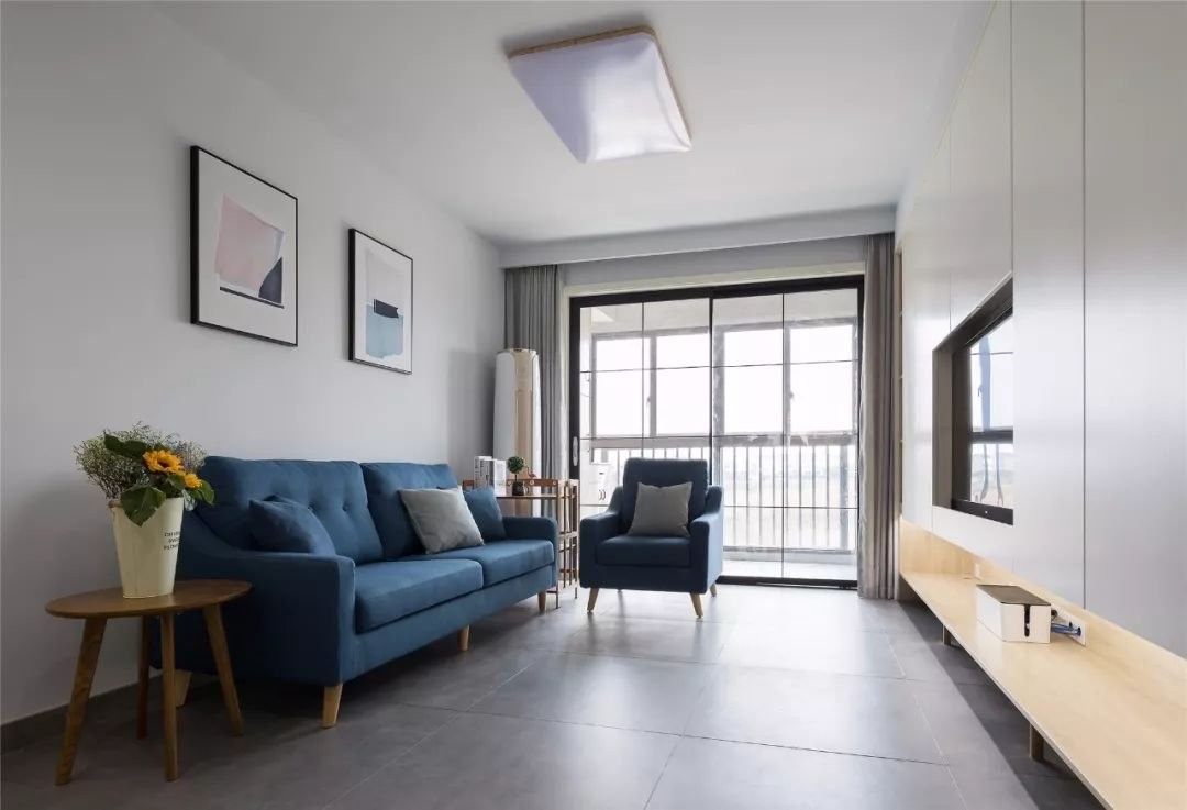 灰色地砖,搭配蓝色布艺沙发,质感满满。客厅不吊顶,装了吸顶灯,沙发墙用挂画装饰,