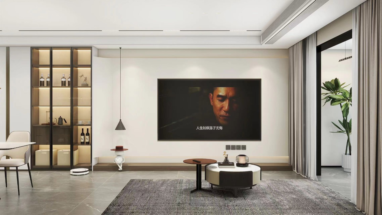 电视背景墙采用石膏板刷漆的方式,把超薄电视给嵌入进去,上下预留反光灯槽,为了和餐边柜连接达到统一,采用了弧形过度的设计手法。