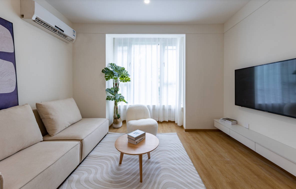 客厅采用白色和奶油色,阳台与客厅和餐厅连载一起,整体更加通透,利用这个小阳台放上一盆可以释放二氧化碳的新鲜绿植。配上遮光纱帘,阳光透过纱帘照射在屋内,带来一丝温馨,呈现出一种简约温馨舒适,而从容的空间氛围感。