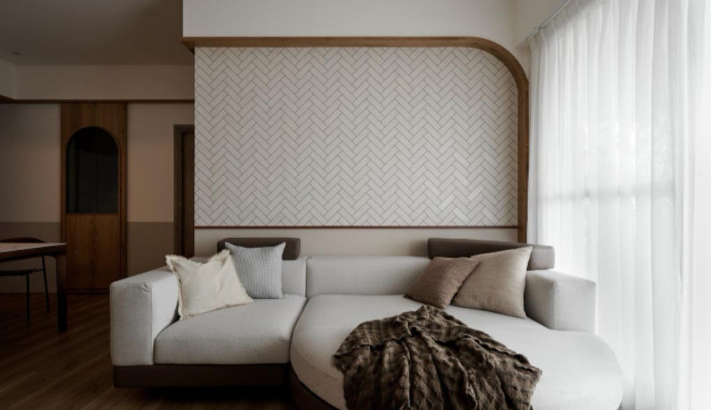 客厅软装的搭配以整个空间中的灰白色系为基础。柔软清爽的沙发梦幻飘逸的窗帘以及毛毯都是同色系不同材质在同一空间中的融合。小型原木茶几也与小体量的客厅空间更为适配。带有自然趣味的墙面设计让人一秒感受到生活中的小确幸。