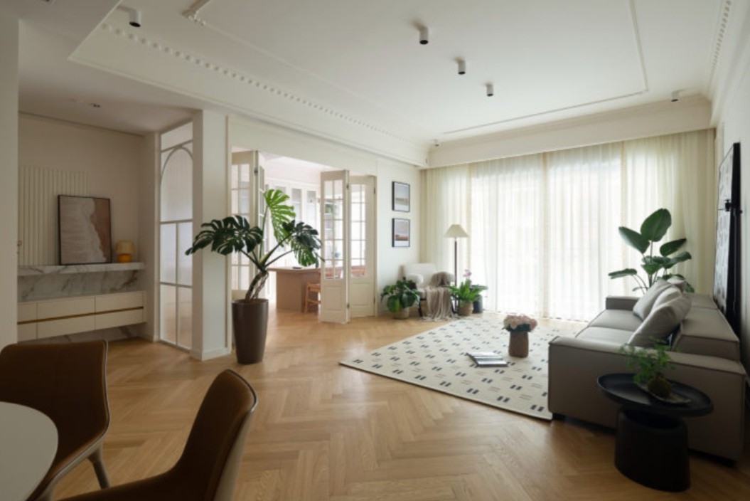 客厅大面积保留了原顶,局部边顶+石膏线造型为风格呈现注入灵魂,也避免了层高降低带来压抑感。