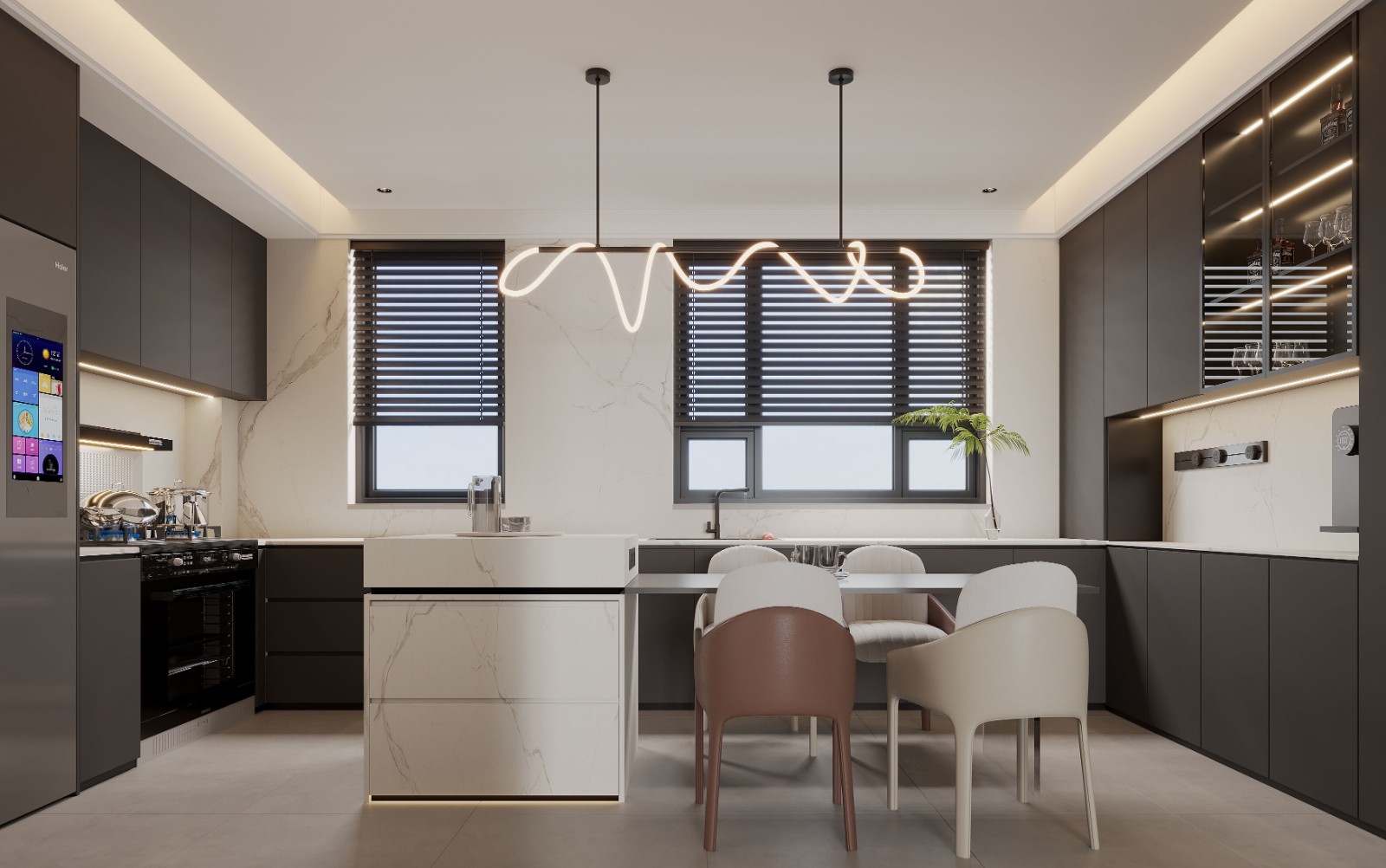 开放式厨房与客厅、餐厅相连,设计简洁流畅,利用极简风格的整体设计风格来塑造一个充满活力和自然的空间氛围。