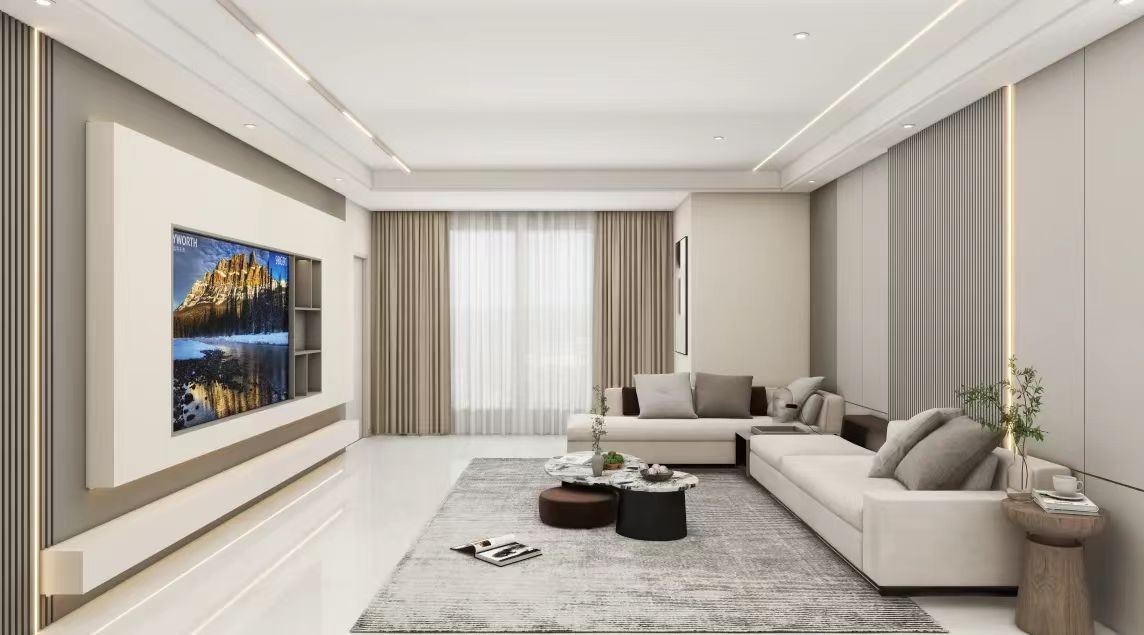 客餐厅全开放式设计,将阳台打造成餐厅区。横梁做弧形处理过渡,柔和空间棱角。极简无主灯布局+灯带嵌入,制造出悬浮效果。