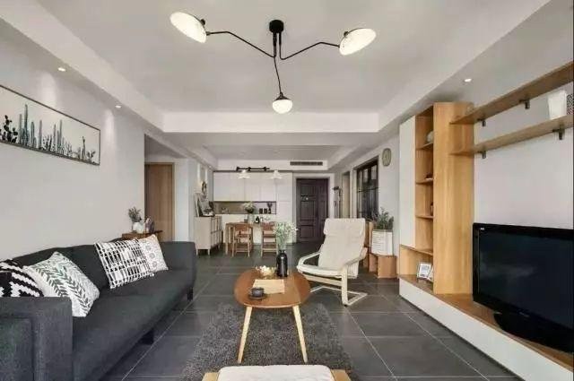 客厅电视背景墙是现场定制的组合柜,客餐厅地面采用卡布奇诺深灰色地砖,这样可以增加与家具的木色感对比哦。